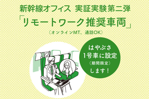 JR東日本は、JR北海道と連携して、東北・北海道新幹線「はやぶさ」のうち、平日に運行する全列車の1号車を「リモートワーク推奨車両」に設定し、始発駅から終着駅までの区間で「新幹線オフィス」実証実験を行なう。実施期間は6月14日から7月16日までの平日。今年2月に行なった実証実験第1弾に続くもので、今回は対象列車や区間を拡大する。